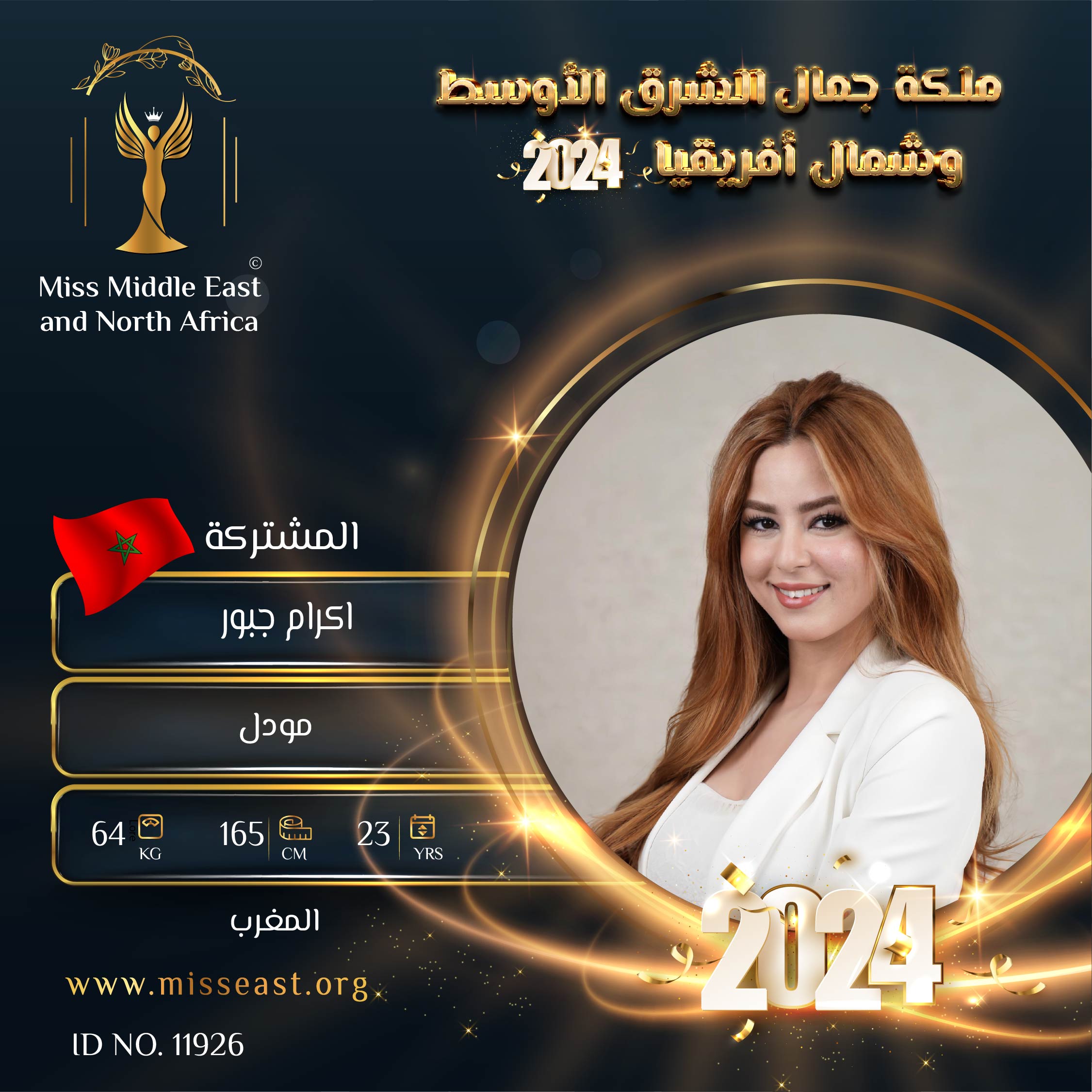 اكرام جبور ملكة جمال الشرق الأوسط وشمال أفريقيا عن المغرب لعام 2024 0 صوت العمر :23 الدولة : المغرب انضمت في : 2024-05-26 مشاركة على: Richmond Enterprise London Ltd
