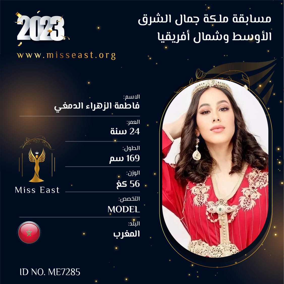 فاطمة الزهراء الدمغي 5 صوت العمر :24 الدولة : المغرب انضمت في : 2023-09-01 مشاركة على: Richmond Enterprise London Ltd