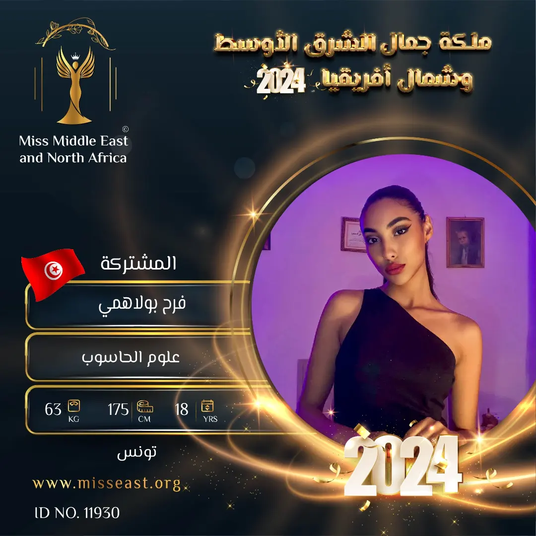 فرح بولاهمي الوصيفة الأولى لملكة جمال تونس لعام 2024 0 صوت العمر :18 الدولة : تونس انضمت في : 2024-05-22 مشاركة على: Richmond Enterprise London Ltd