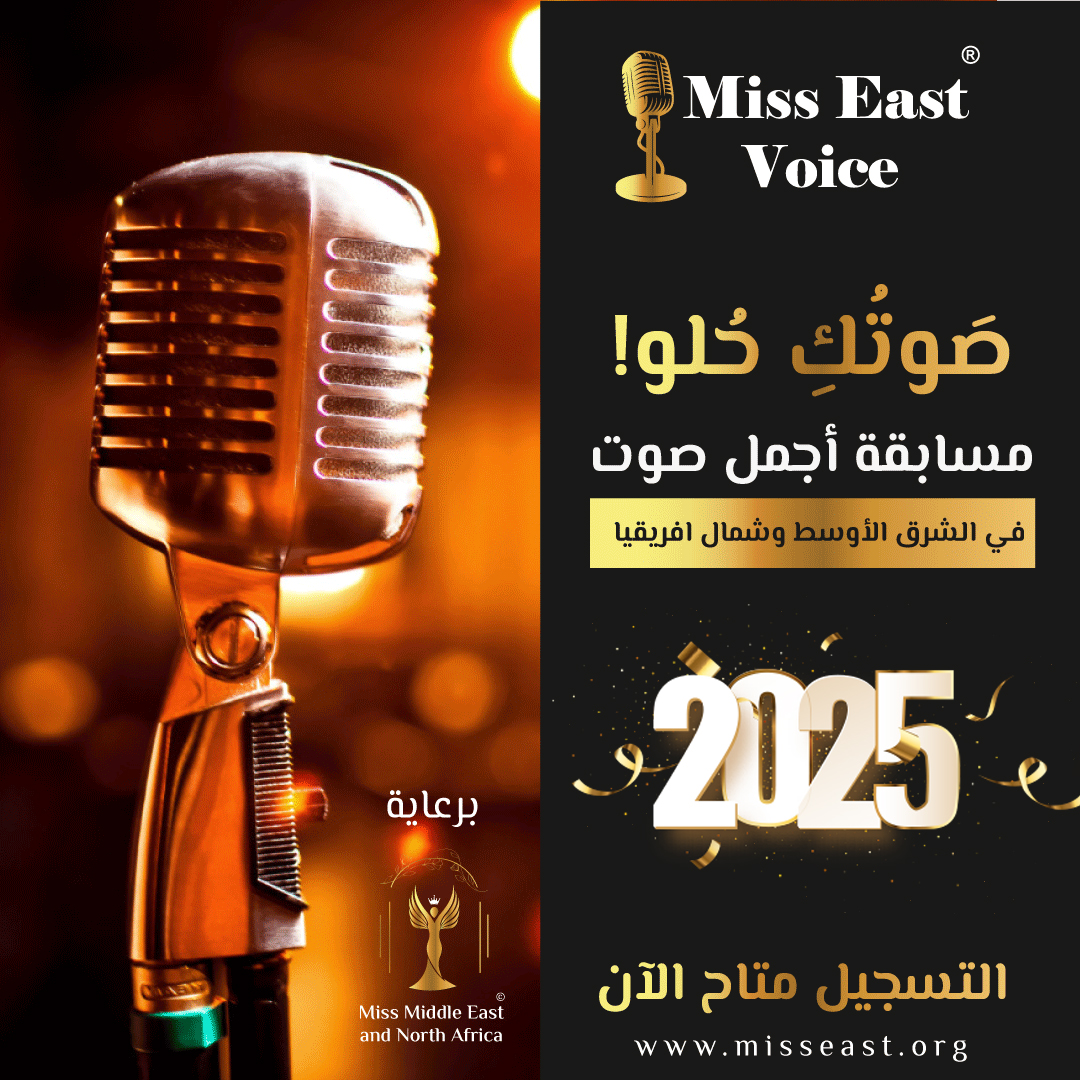 لأن الغناء والموسيقى هما أدب القلب، ولغة الشعوب المشتركة .تدعو هيئة MISS MIDDLE EAST AND NORTH AFRICA LTD جميع الفتيات اللواتي يمتلكن الأصوات الجميلة والمؤثرة في العالم العربي للمشاركة في فعالية :studio_microphone:Miss East Voice لموسم 2024 التي ستقام على مستوى الدول العربية في الشرق الأوسط وشمال أفريقيا، بغية اكتشاف المواهب الفنية والغنائية وإتاحة الفرصة لهن ليكونوا نجوم المستقبل الغنائي، حيث سيتم اختيار صاحبة أجمل صوت من 22 دولة عربية تنطبق عليها شروط التقديم وستخضع لعدة اختبارات فنية تحت إشراف كوادر مختصة من الأساتذة والموسيقيين لتقديم فن راق يليق بالشرق الأوسط وشمال أفريقيا.